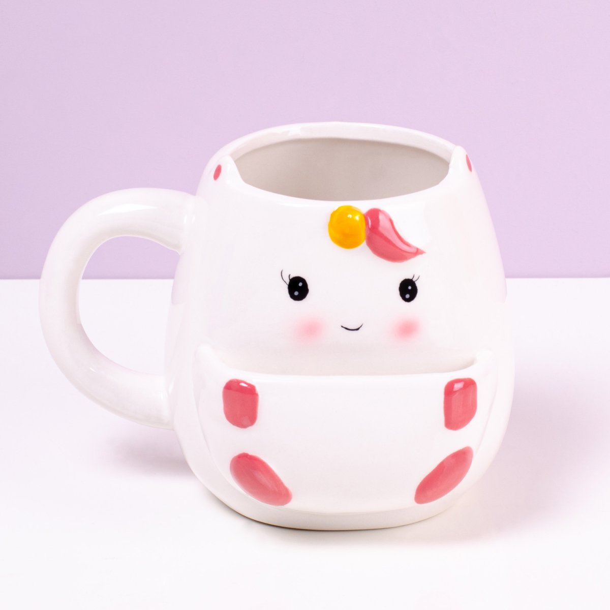 Dierenmok met koekvakje van Out of the Blue. Schattige beker met het uiterlijk van een eenhoorn, die met zijn pootjes een vakje aan de voorkant knuffelt waar je een koekje in kunt doen. Super schattige beker voor warme chocolademelk, thee of koffie. De mok heeft een inhoud van 450 milliliter. Afmeting: 12 x 9 x 15 centimeter.