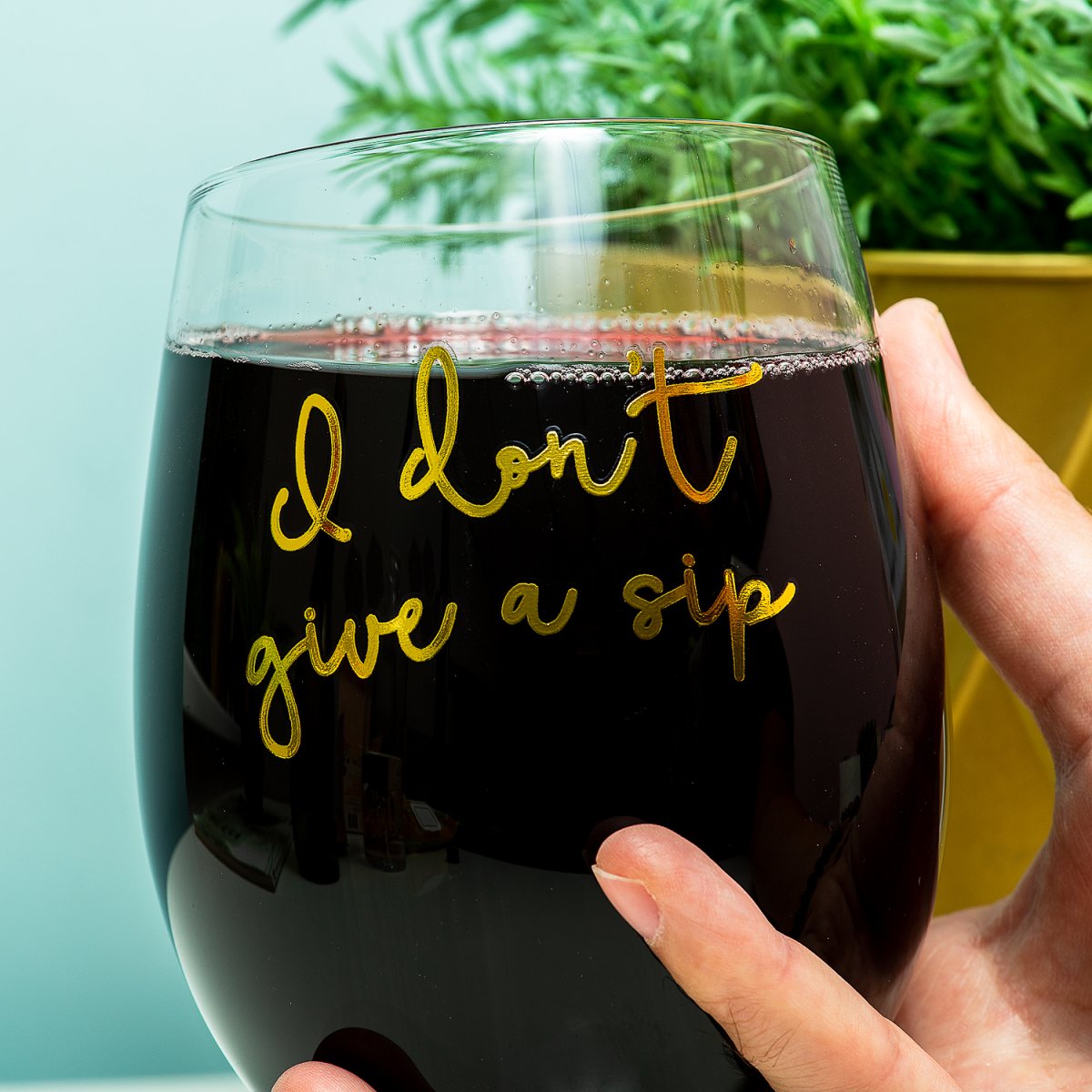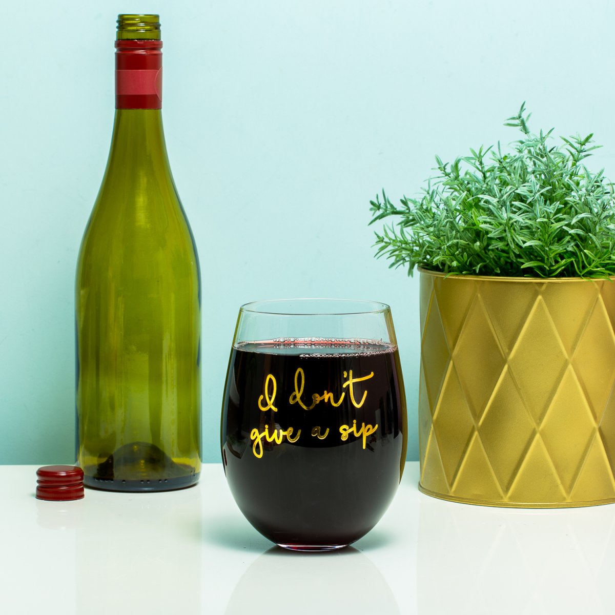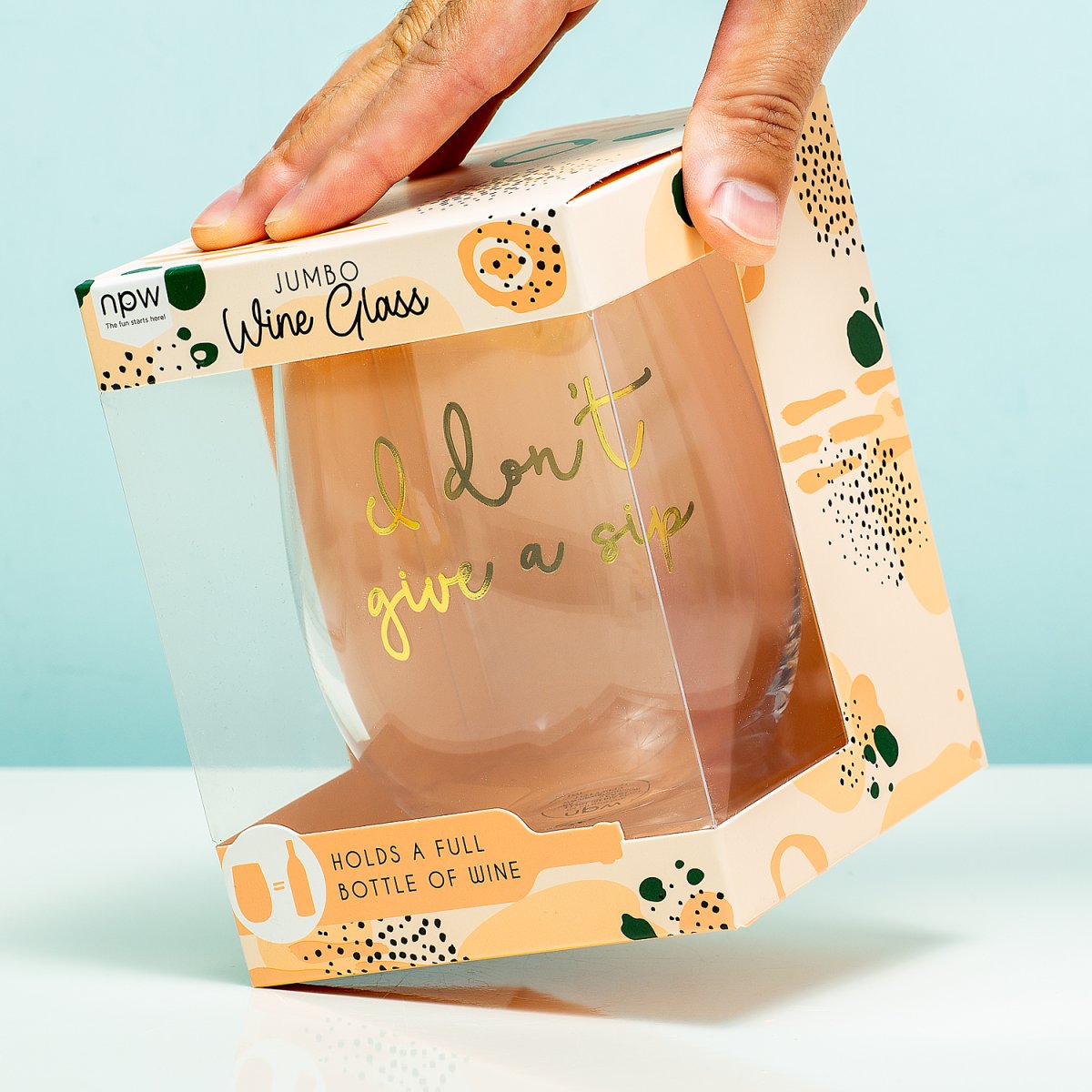 Een familieweekend, vrijgezellenfeestje of kerstdiner wordt een stuk leuker met het Gigantisch wijnglas (800 ml) van NPW London. Dit stamloze wijnglas is zo groot dat er een hele fles wijn in past. Zo krijgt de opmerking ‘een glaasje nog’ direct een heel andere betekenis! Op het glas staat in goudkleurige letters de tekst I don’t give a sip.