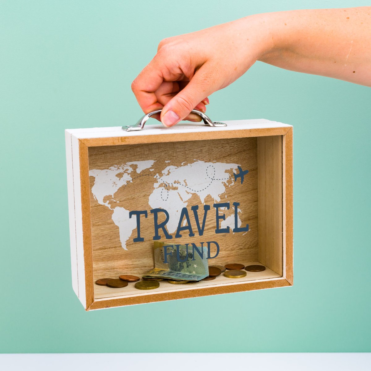 Spaar jij voor een droomreis? De Koffer spaarpot van Out of the Blue helpt je om je spaardoel te halen. Deze grappige spaarpot lijkt op een koffertje, maar is toch echt bedoeld om je geld in te stoppen. Hij heeft een transparante voorkant, zodat je goed kunt zien hoeveel geld er al in zit. Op de achtergrond staat de wereldkaart, op de voorkant de tekst Travel Fund en een vliegtuigje.