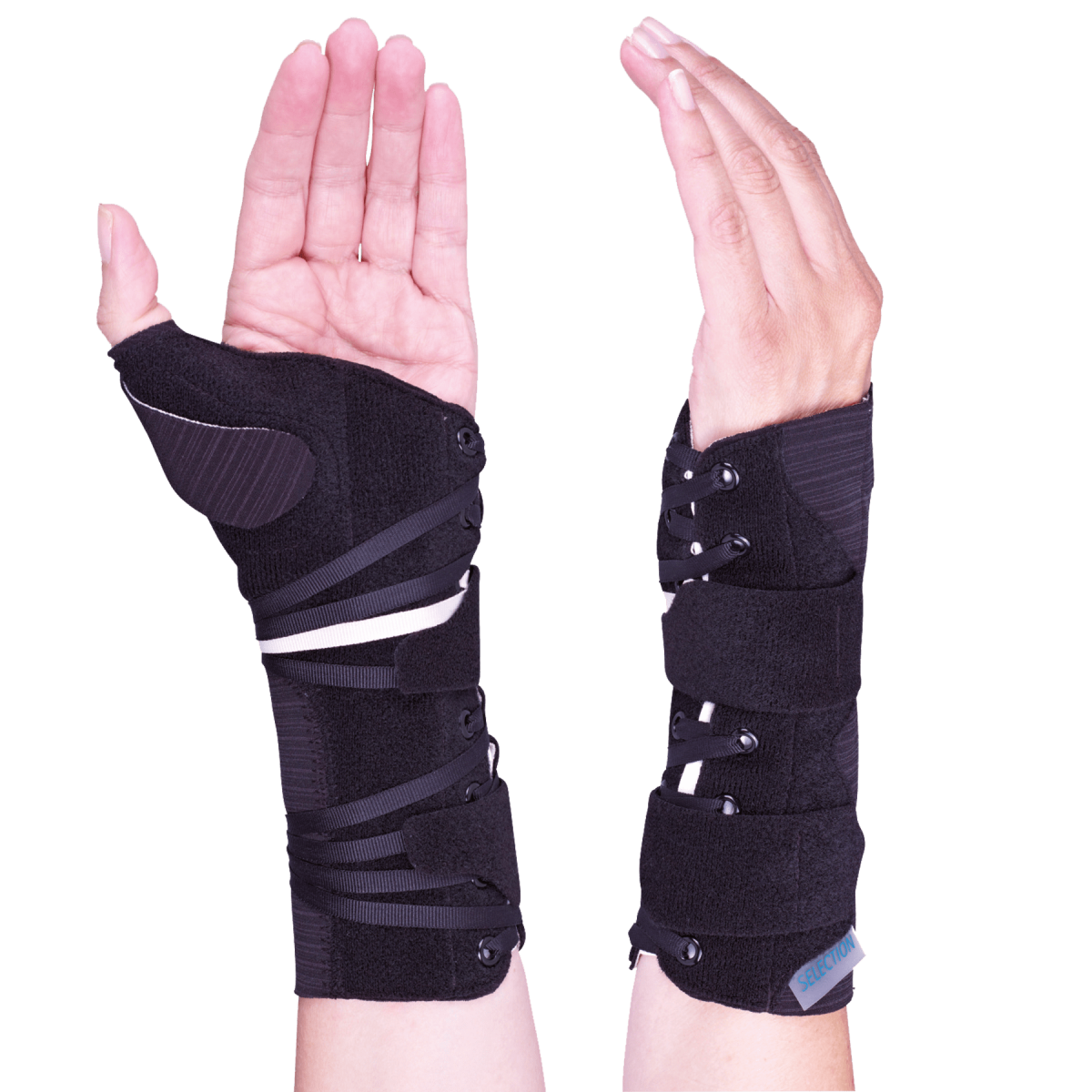 Deze serie polsbandages Selection zijn vormgegeven uit innovatief materiaal voor een meer modern en fris design. De polsbrace bestaat uit 2 elastische lagen die tegen elkaar aan zijn gelamineerd met daartussen een kern van meer rigide materiaal waarmee de gewenste stabiliteit wordt verkregen. SELECTION Rigid biedt meer stabiliteit rondom de duim door daar gebruik te maken van niet elastisch materiaal. Dit model heeft een aanpasbare vetersluiting aan de ulnaire zijde.