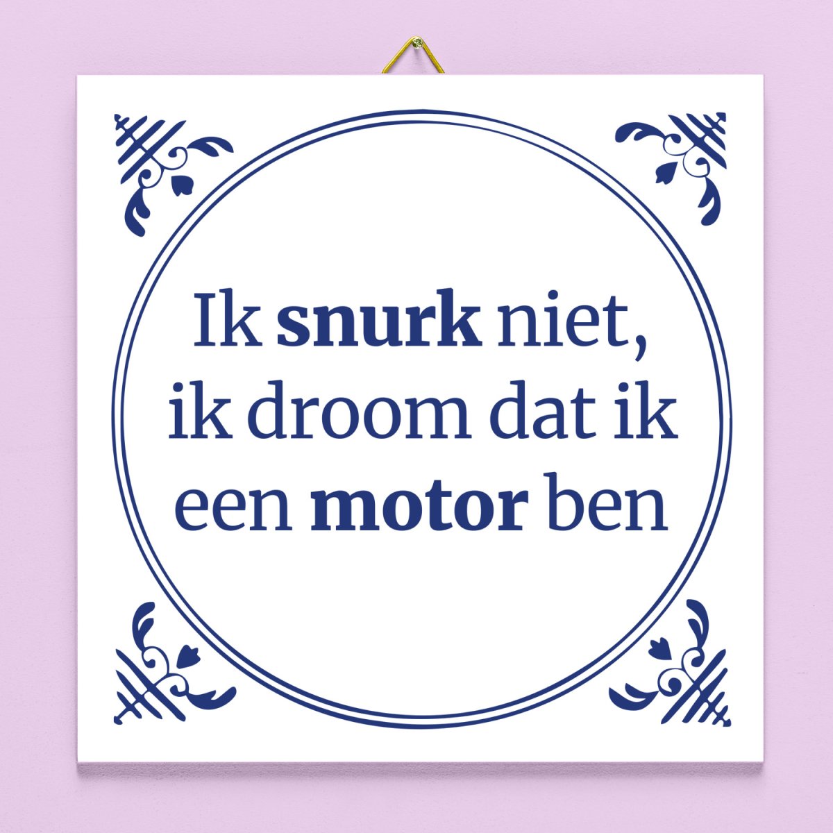 Je hebt van die mensen die overal een mooi verhaal van weten te breien. Zo snurken ze bijvoorbeeld niet, maar dromen dat ze een motor zijn. Precies voor die personen is er het Tegeltje Ik snurk niet. Een grappig tegeltje voor in jullie slaapkamer. Op het op Delfts blauw geïnspireerde tegeltje staat de tekst: Ik snurk niet, ik droom dat ik een motor ben. Leuk om cadeau te geven op z’n verjaardag of voor Vaderdag.