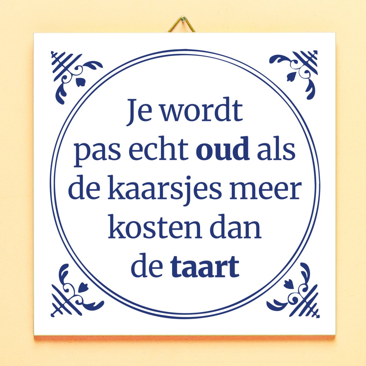 Een hele taart vol kaarsjes: dat is toch leuk? Helemaal als de jarige het liever niet over zijn of haar leeftijd wil hebben, omdat diegene zich oud voelt. Het Tegeltje Je wordt pas echt oud… is een grappig tegeltje om de jarige te plagen met zijn of haar leeftijd. Op de tegel staat de spreuk: Je wordt pas echt oud als de kaarsjes meer kosten dan de taart.