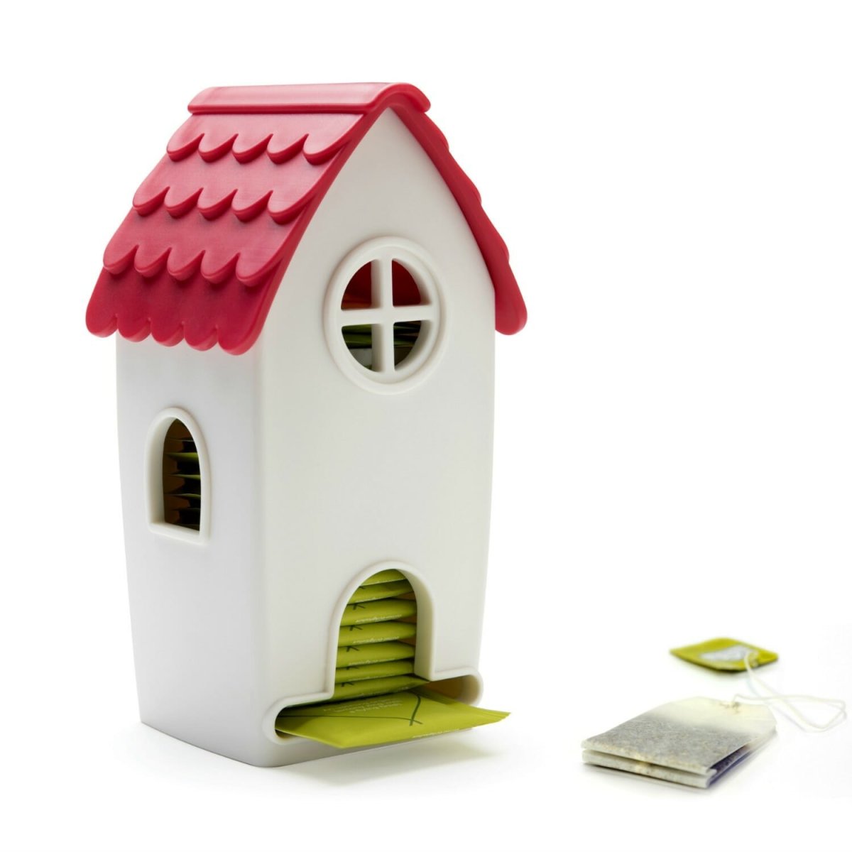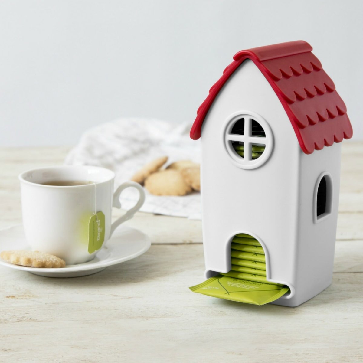 Theezakjesdispenser dat eruit ziet als een huisje van Ototo